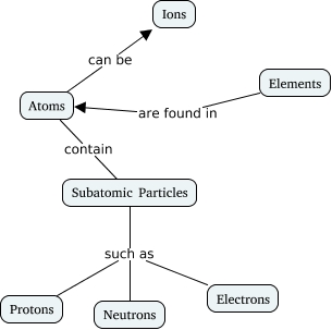 This Concept Map, created with IHMC CmapTools, has information related to: Basic Structure of Matter, Elements are found in Atoms, Subatomic Particles such as Protons, Atoms can be Ions, Atoms contain Subatomic Particles, Subatomic Particles such as Neutrons, Subatomic Particles such as Electrons