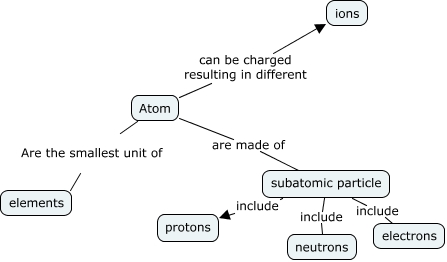 This Concept Map, created with IHMC CmapTools, has information related to: Matter, subatomic particle include electrons, subatomic particle include protons, Atom are made of subatomic particle, Atom can be charged resulting in different ions, subatomic particle include neutrons, Atom Are the smallest unit of elements
