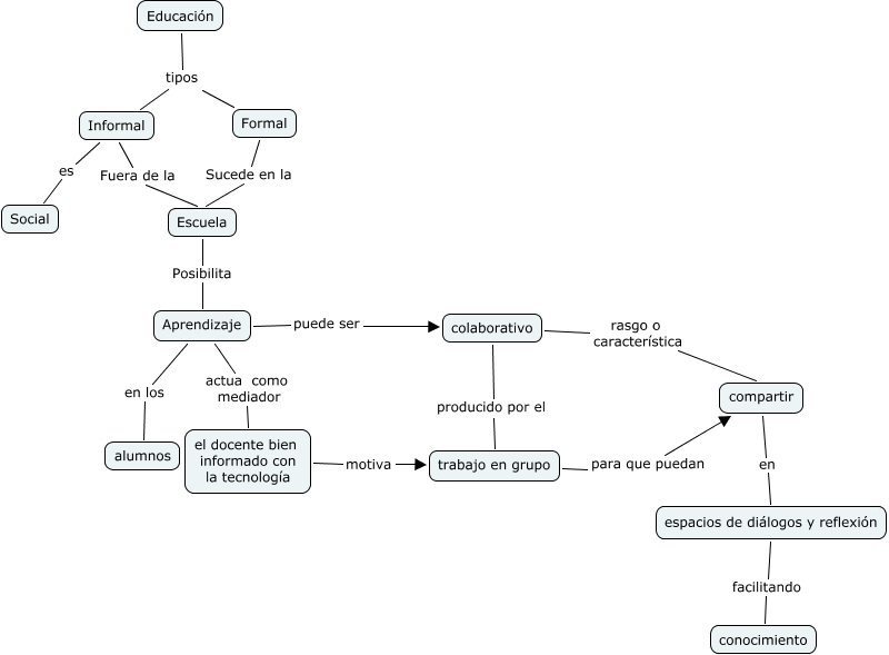 Este Cmap, tiene información relacionada con: Mapa conceptual N°2, colaborativo producido por el trabajo en grupo, espacios de diálogos y reflexión facilitando conocimiento, colaborativo rasgo o característica compartir, Aprendizaje en los alumnos, Informal es Social, compartir en espacios de diálogos y reflexión, Educación tipos Informal, trabajo en grupo para que puedan compartir, Escuela Posibilita Aprendizaje, Formal Sucede en la Escuela, el docente bien informado con la tecnología motiva trabajo en grupo, Informal Fuera de la Escuela, Aprendizaje puede ser colaborativo, Educación tipos Formal, Aprendizaje actua como mediador el docente bien informado con la tecnología
