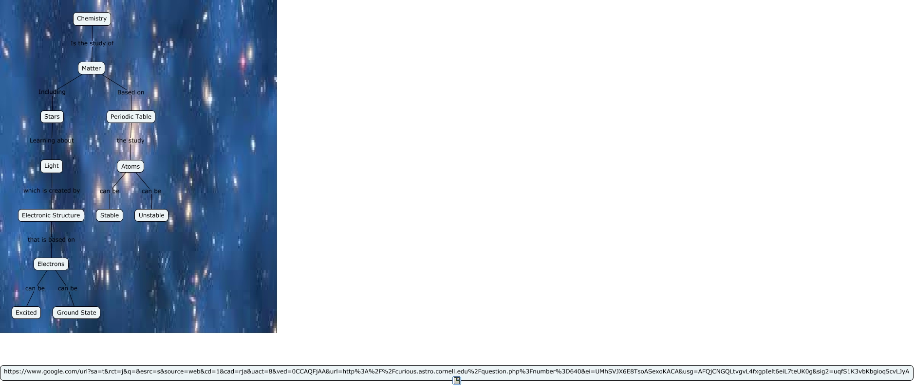 This Concept Map, created with IHMC CmapTools, has information related to: Chemistry and the Cosmic Evolution, Light which is created by Electronic Structure, Periodic Table the study Atoms, Electrons can be Ground State, Electronic Structure that is based on Electrons, Electrons can be Excited, Chemistry Is the study of Matter, Atoms can be Stable, Matter Based on Periodic Table, Atoms can be Unstable, Stars Learning about Light, Matter Including Stars