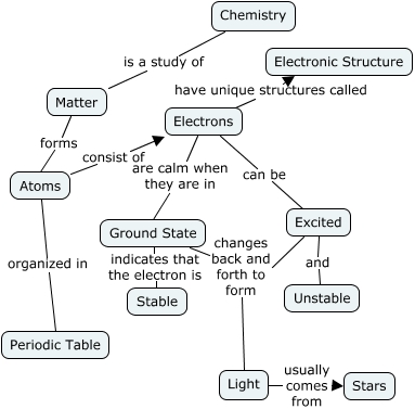 This Concept Map, created with IHMC CmapTools, has information related to: Chemistry and Cosmic Evolution, Electrons have unique structures called Electronic Structure, Chemistry is a study of Matter, Excited changes back and forth to form Light, Ground State changes back and forth to form Light, Electrons are calm when they are in Ground State, Light usually comes from Stars, Excited and Unstable, Ground State indicates that the electron is Stable, Atoms organized in Periodic Table, Matter forms Atoms, Electrons can be Excited, Atoms consist of Electrons
