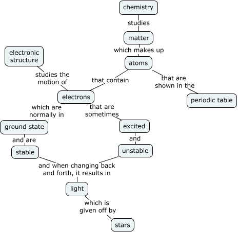 This Concept Map, created with IHMC CmapTools, has information related to: Chemistry and Cosmic Evolution, stable and when changing back and forth, it results in light, electronic structure studies the motion of electrons, electrons that are sometimes excited, electrons which are normally in ground state, matter which makes up atoms, atoms that contain electrons, light which is given off by stars, unstable and when changing back and forth, it results in light, atoms that are shown in the periodic table, chemistry studies matter, excited and unstable, ground state and are stable