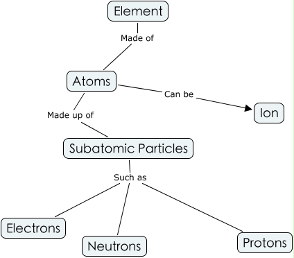 This Concept Map, created with IHMC CmapTools, has information related to: Untitled 1, Atoms Can be Ion, Subatomic Particles Such as Protons, Atoms Made up of Subatomic Particles, Element Made of Atoms, Subatomic Particles Such as Neutrons, Subatomic Particles Such as Electrons