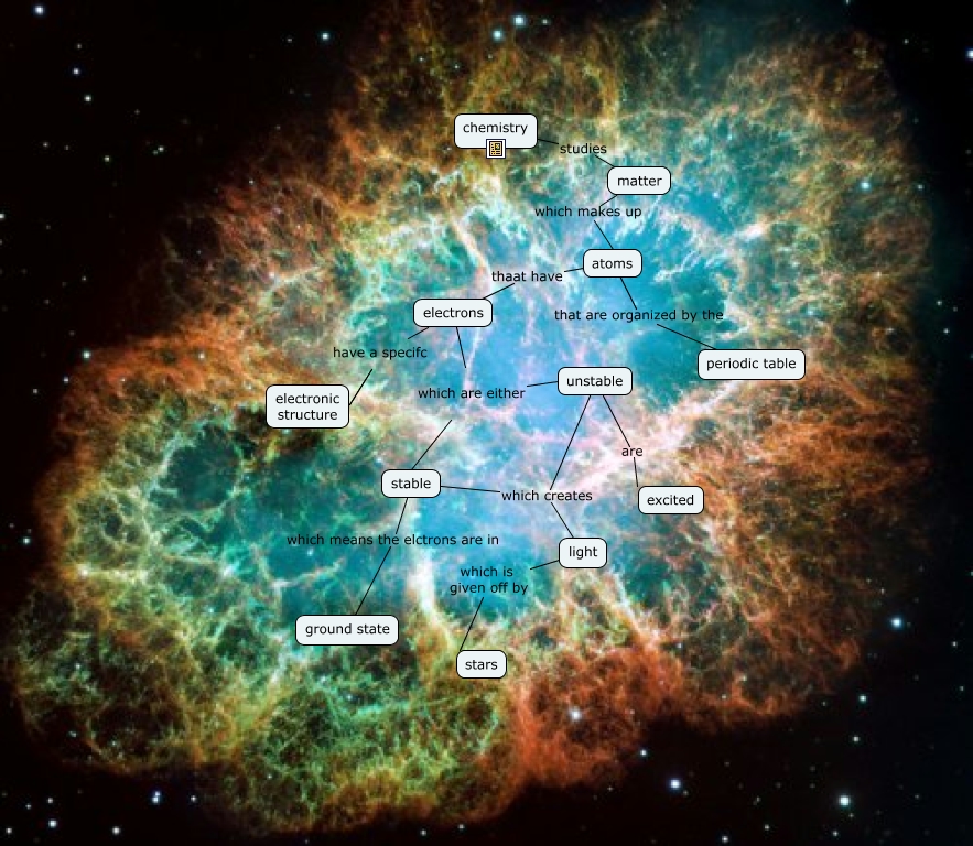 This Concept Map, created with IHMC CmapTools, has information related to: How Chemistry Relates to Cosmic Evolution, atoms that are organized by the periodic table, unstable are excited, electrons which are either unstable, stable which creates light, atoms thaat have electrons, light which is given off by stars, electrons have a specifc electronic structure, chemistry studies matter, unstable which creates light, matter which makes up atoms, electrons have a specifc electronic structure, electrons which are either stable, stable which means the elctrons are in ground state