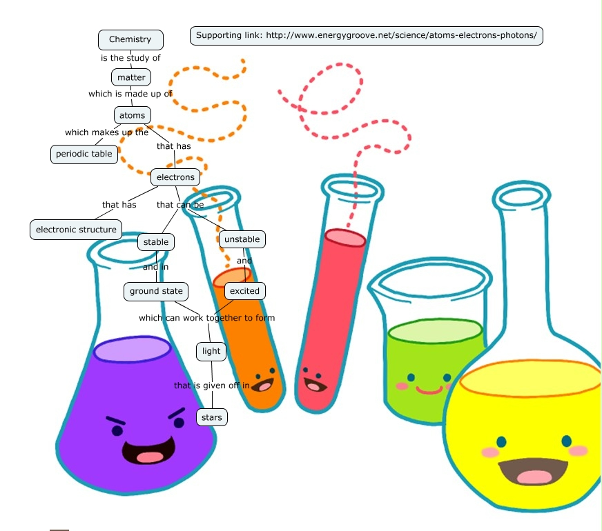This Concept Map, created with IHMC CmapTools, has information related to: How Chemistry Relates to Cosmic Evolution CM, ground state which can work together to form light, matter which is made up of atoms, electrons that can be stable, atoms that has electrons, stable and in ground state, excited which can work together to form light, atoms which makes up the periodic table, light that is given off in stars, electrons that can be unstable, Chemistry is the study of matter, electrons that has electronic structure, unstable and excited