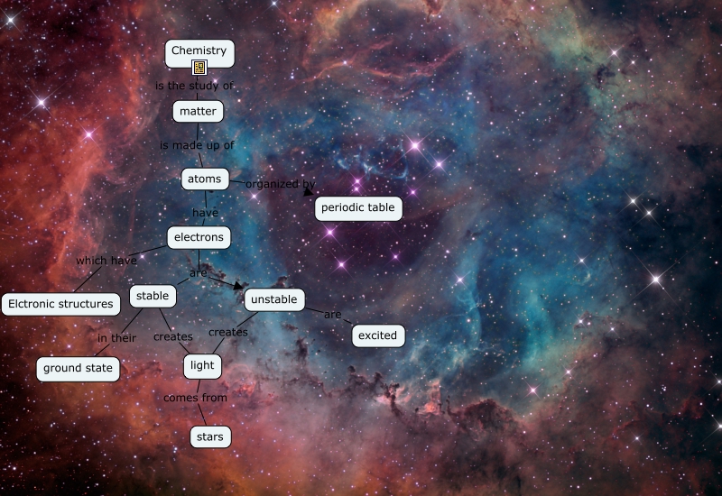 This Concept Map, created with IHMC CmapTools, has information related to: Chemistry and Cosmic Evolution, stable in their ground state, electrons which have Elctronic structures, Chemistry is the study of matter, unstable creates light, atoms have electrons, atoms organized by periodic table, matter is made up of atoms, electrons are unstable, unstable are excited, light comes from stars, electrons are stable, stable creates light