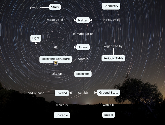 This Concept Map, created with IHMC CmapTools, has information related to: Cosmic Evolution, Ground State which is stable, Atoms organized by Periodic Table, Stars made up of Matter, Matter is made up of Atoms, Electrons can be Ground State, Electronic Structure of Atoms, Stars produce Light, Atoms contain Electrons, Electrons can be Excited, Excited and release Light, Excited which is unstable, Electrons make up Electronic Structure, Chemistry the study of Matter