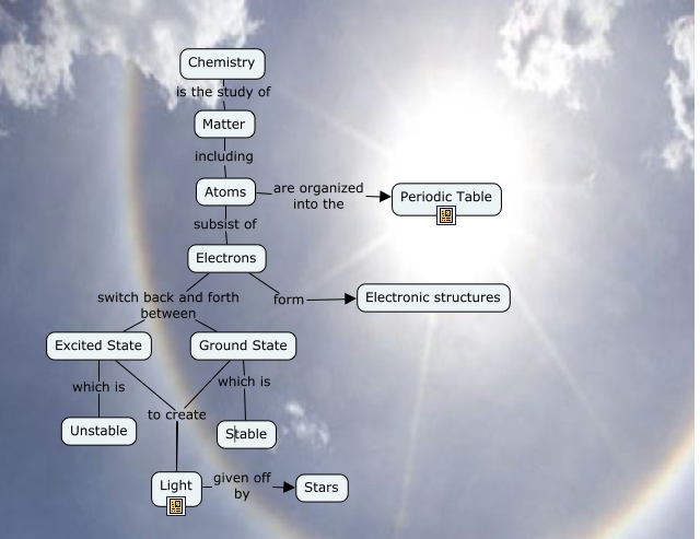 This Concept Map, created with IHMC CmapTools, has information related to: Chemistry in Cosmic Evolution, Electrons switch back and forth between Ground State, Electrons form Electronic structures, Matter including Atoms, Ground State which is Stable, Excited State which is Unstable, Atoms subsist of Electrons, Ground State to create Light, Electrons switch back and forth between Excited State, Atoms are organized into the Periodic Table, Excited State Light, Chemistry is the study of Matter, Light given off by Stars