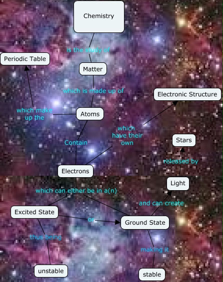 This Concept Map, created with IHMC CmapTools, has information related to: Cosmic Evolution, Electrons which can either be in a(n) Excited State, Electrons which have their own Electronic Structure, Atoms which make up the Periodic Table, Light released by Stars, Electrons which can either be in a(n) Ground State, Ground State making it stable, Excited State or Ground State, Ground State and can create Light, Atoms Contain Electrons, Matter which is made up of Atoms, Excited State thus being unstable, Chemistry is the study of Matter