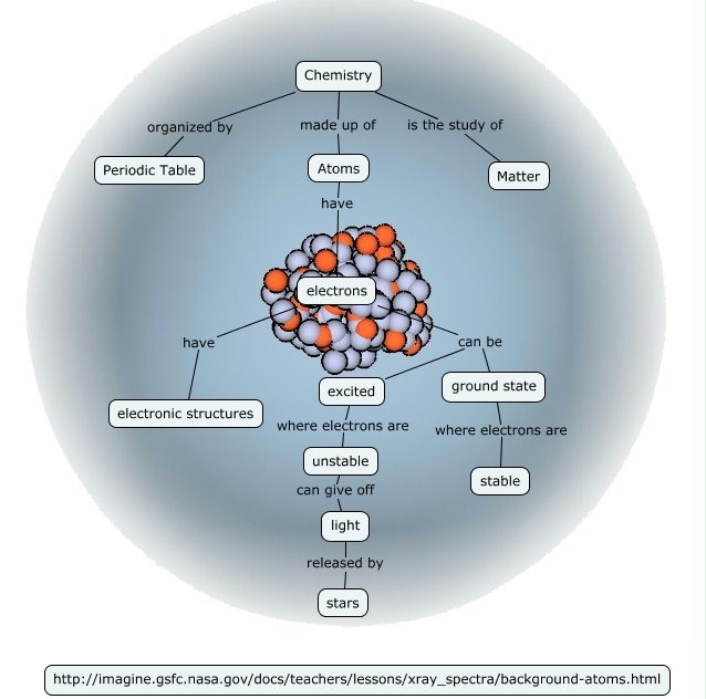 This Concept Map, created with IHMC CmapTools, has information related to: Chemistry in Relation to Cosmic Evolution, Chemistry made up of Atoms, unstable can give off light, electrons can be excited, Chemistry organized by Periodic Table, electrons can be ground state, Chemistry is the study of Matter, Atoms have electrons, electrons have electronic structures, light released by stars, excited where electrons are unstable, ground state where electrons are stable