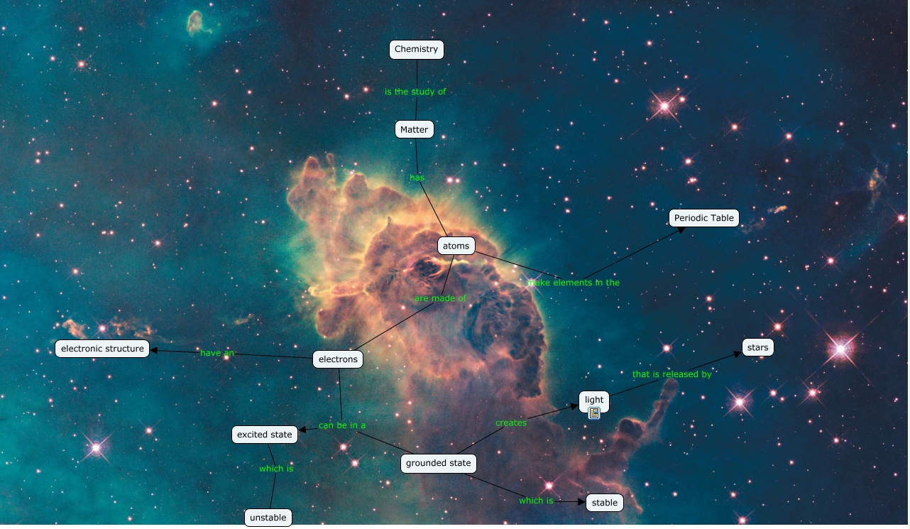 This Concept Map, created with IHMC CmapTools, has information related to: Chemistry and Cosmic Evolution, Matter has atoms, atoms are made of electrons, grounded state which is stable, excited state which is unstable, electrons can be in a excited state, Chemistry is the study of Matter, electrons can be in a grounded state, atoms make elements in the Periodic Table, grounded state creates light, light that is released by stars, electrons have an electronic structure