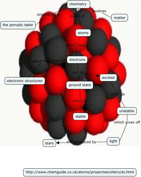This Concept Map, created with IHMC CmapTools, has information related to: Chemistry and Cosmic Evolution, electrons can be excited, unstable which gives off light, chemistry involves matter, chemistry made of atoms, chemistry organized by the periodic table, atoms which have electrons, light also produced by stars, excited which is unstable, ground state which is stable, electrons can be ground state, electrons which have electronic structures