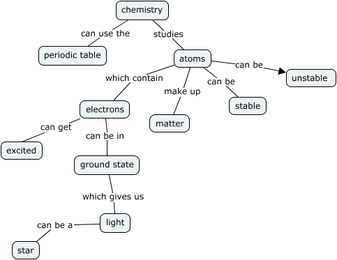 This Concept Map, created with IHMC CmapTools, has information related to: Cosmic Evolution, ground state which gives us light, atoms can be stable, electrons can be in ground state, atoms which contain electrons, chemistry can use the periodic table, atoms can be unstable, light can be a star, electrons can get excited, chemistry studies atoms, atoms make up matter