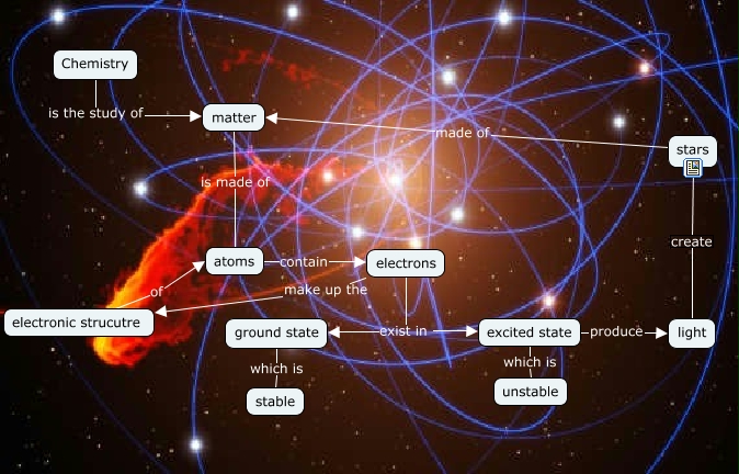 This Concept Map, created with IHMC CmapTools, has information related to: Cosmic Evolution, electronic strucutre of atoms, Chemistry is the study of matter, electrons exist in ground state, excited state which is unstable, atoms contain electrons, electrons make up the electronic strucutre, excited state produce light, matter is made of atoms, stars create light, electrons exist in excited state, stars made of matter, ground state which is stable
