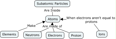 This Concept Map, created with IHMC CmapTools, has information related to: Elements and Atoms, Elements Make Atoms, Neutrons Are made of Atoms, Subatomic Particles Are Inside Atoms, Ions When electrons aren't equal to protons Atoms, Proton Are made of Atoms, Electrons Are made of Atoms
