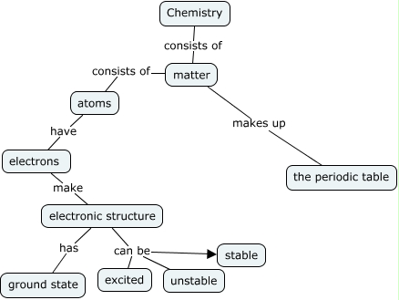 This Concept Map, created with IHMC CmapTools, has information related to: Chemistry, Chemistry consists of matter, matter makes up the periodic table, electrons make electronic structure, electronic structure can be unstable, electronic structure has ground state, atoms have electrons, matter consists of atoms, electronic structure can be excited, electronic structure can be stable