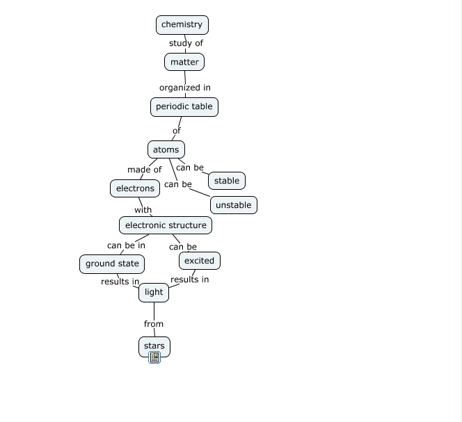 This Concept Map, created with IHMC CmapTools, has information related to: The Relation of Chemistry to Cosmic Evolution, excited results in light, periodic table of atoms, electronic structure can be excited, atoms made of electrons, electronic structure can be in ground state, atoms can be stable, chemistry study of matter, matter organized in periodic table, light from stars, ground state results in light, electrons with electronic structure, atoms can be unstable