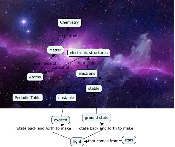 This Concept Map, created with IHMC CmapTools, has information related to: How Chemistry Relates to Cosmic Evolution, Atoms are made of Matter, unstable when electrons, ground state are in stable, electronic structures consist of Atoms, stars that comes from light, light rotate back and forth to make ground state, electrons that shape electronic structures, Periodic Table help make up Atoms, light rotate back and forth to make excited, stable when electrons, excited get unstable, Matter is a part of Chemistry