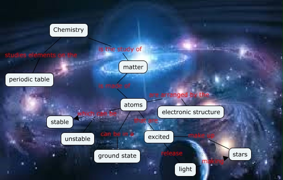 This Concept Map, created with IHMC CmapTools, has information related to: Cosmic Evolution, atoms that are excited, Chemistry studies elements on the periodic table, excited release light, atoms are arranged by the electronic structure, atoms which can be stable, atoms which can be unstable, excited make up stars, matter is made of atoms, light making stars, atoms can be in a ground state, Chemistry is the study of matter
