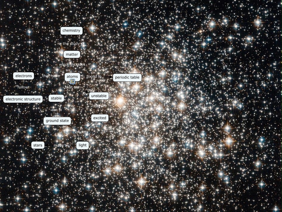 This Concept Map, created with IHMC CmapTools, has information related to: Chemistry and Cosmic Evolution, light made by stars, ground state creates light, electrons follow electronic structure, atoms that have electrons, matter which includes atoms, atoms that are unstable, chemistry is the study of matter, atoms found in periodic table, atoms that are stable, stable are in ground state, excited creates light, unstable that are excited