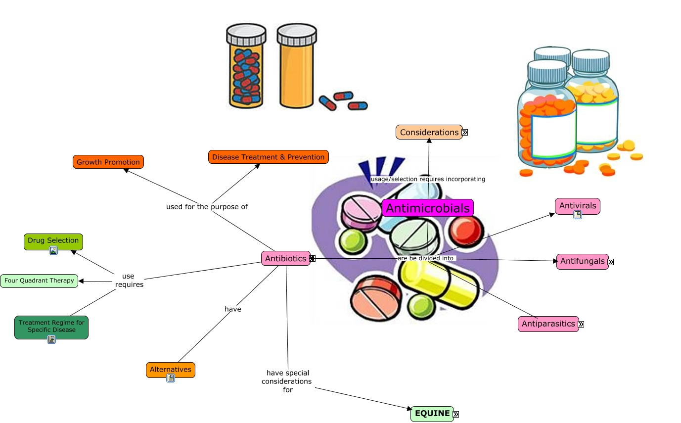 This Concept Map, created with IHMC CmapTools, has information related to: Antimicrobials, Aminoglycoside are Bactericidal disrupt cell wall NEPHROTOXIC, Gram -ve treated by Aminoglycoside, 1st line tx for gram +ve! except Anaerobe: Bacteroides fragilis, Gram +ve treated by Penicillins, Ceftiofur caution disbacteriosis, Ceftiofur indications Resp. Pathogens PNEUMONIA, Cephalosporins SYNERGISTIC WITH Aminoglycosides, Considerations such as Client Compliance, Aminoglycoside are for: E.coli, psuedomonas, mycobacterium mycoplasma, Common Oral ABs (Broad Spectrum) that are Metronidazole Chloramphenicol Trimethoprim-sulfa Enrofloxacin, Aminoglycoside such as Amikacin, Antimicrobials are be divided into Antivirals, Antibiotics used for the purpose of Disease Treatment & Prevention, Considerations such as Cost of Treatment, Antibiotics use requires Drug Selection, Ectoparasite Tx include Demodex Tx, Gentamycin better for Neuromuscular block prior to Surgery with 1/2 dose & Anaes., Considerations such as Withdrawal Time, Considerations such as Disease Location, Antiparasitics consist of Ectoparasite Tx
