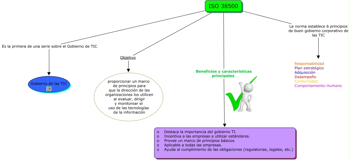 Este Cmap, tiene información relacionada con: ISO 38500, ISO 38500 Beneficios y características principales o Destaca la importancia del gobierno TI. o Incentiva a las empresas a utilizar estándares. o Provee un marco de principios básicos o Aplicable a todas las empresas. o Ayuda al cumplimiento de las obligaciones (regulatorias, legales, etc.), ISO 38500 Es la primera de una serie sobre el Gobierno de TIC Gobierno de las TIC, ISO 38500 La norma establece 6 principios de buen gobierno corporativo de las TIC Responsabilidad Plan estratégico Adquisición Desempeño Conformidad Comportamiento Humano, ISO 38500 Objetivo proporcionar un marco de principios para que la dirección de las organizaciones los utilicen al evaluar, dirigir y monitorear el uso de las tecnologías de la información