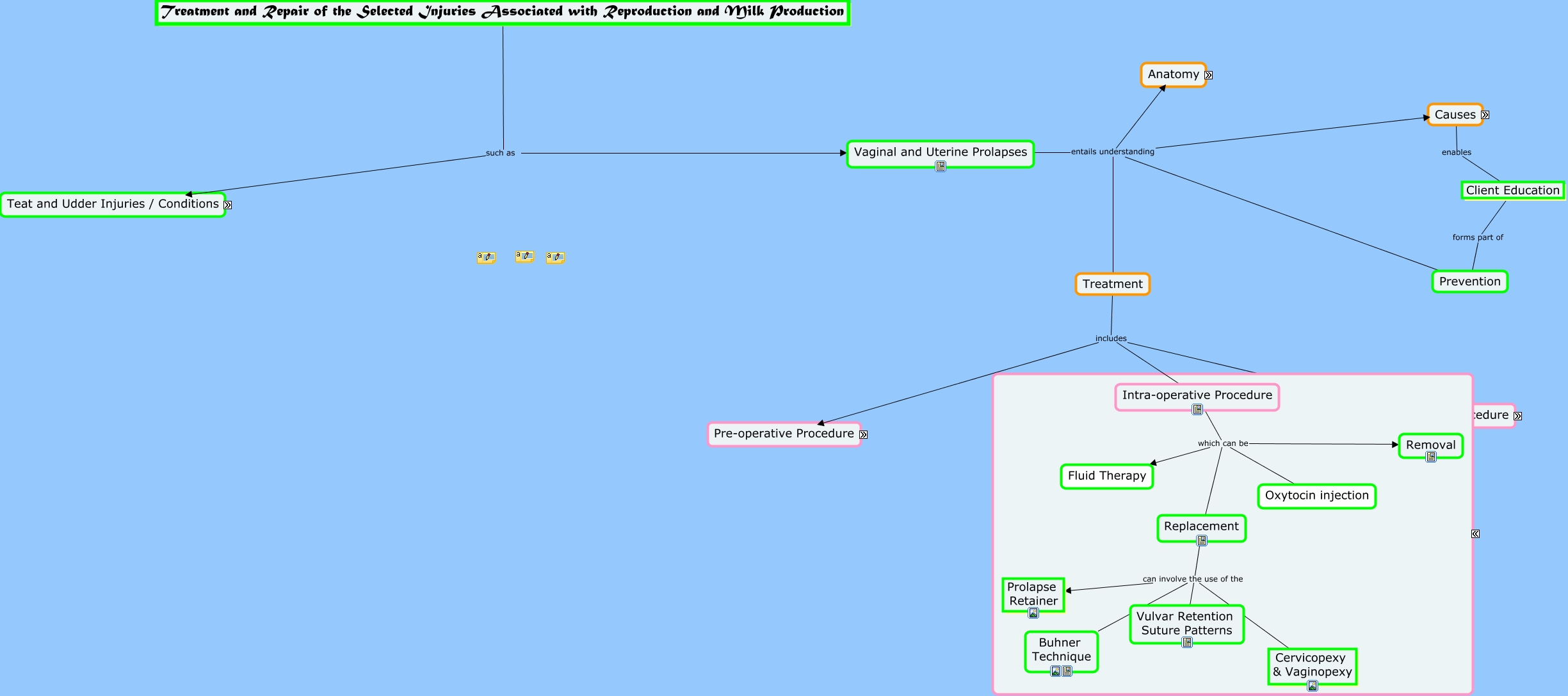This Concept Map, created with IHMC CmapTools, has information related to: Lab 7 - Teat and Udder Surgery-Uterine-Vaginal Prolapses, Gangrenous Mastitis has Consequences, Replacement can involve the use of the Prolapse Retainer, Teat and Udder Injuries / Conditions should be Examined, Post-operative Procedure included Temporary Alterations to Milking Method, 3. Chemical Restraint and Premedication which consisted of Sedative, Replacement can involve the use of the Cervicopexy & Vaginopexy, Restraint followed by Cleaning of prolapsed contents and surrounding tissues, Restraint which should be both Physical, Treatment includes Pre-operative Procedure, Replacement can involve the use of the Vulvar Retention Suture Patterns, Clinical Signs: also include Recumbency, Replacement can involve the use of the Buhner Technique, Post-operative Procedure depends on Prognosis, Pre-operative Procedure involved 5. Assessment of Wound, Post-operative Procedure includes Suture Removal, Restraint which should be both Chemical, 3 Layers which were Skin, Anatomy of Vagina, Signalment usually includes Species: Dairy Cattle &Sheep, Teat and Udder Injuries / Conditions can include Teat Lacerations