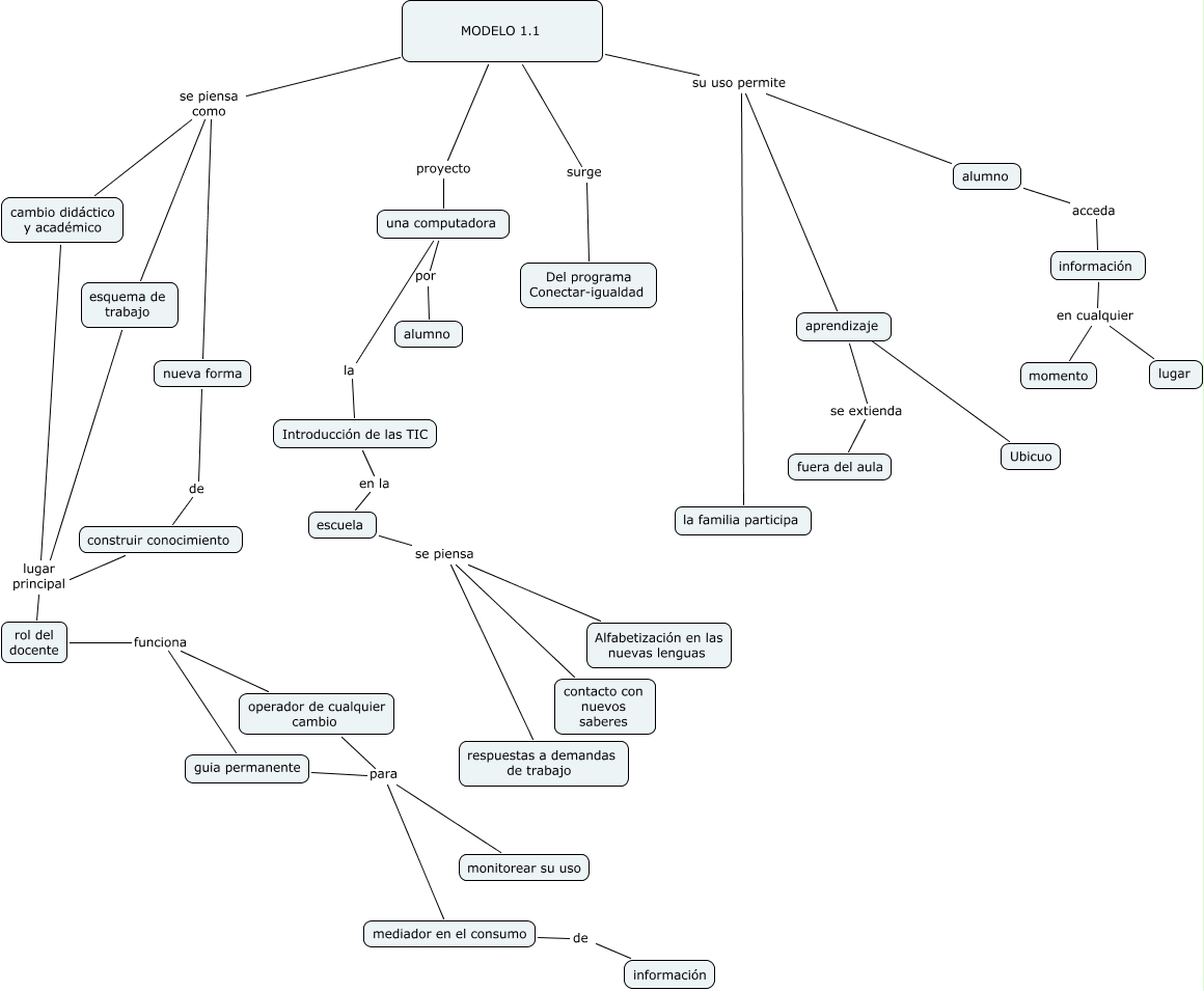 Este Cmap, tiene información relacionada con: Modelo 1.1 ultima corrección, MODELO 1.1 se piensa como nueva forma, MODELO 1.1 su uso permite la familia participa, MODELO 1.1 proyecto una computadora, MODELO 1.1 su uso permite alumno, escuela se piensa Alfabetización en las nuevas lenguas, esquema de trabajo lugar principal rol del docente, mediador en el consumo de información, aprendizaje se extienda fuera del aula, MODELO 1.1 su uso permite aprendizaje, escuela se piensa contacto con nuevos saberes, una computadora por alumno, rol del docente funciona operador de cualquier cambio, operador de cualquier cambio para monitorear su uso, cambio didáctico y académico lugar principal rol del docente, MODELO 1.1 se piensa como cambio didáctico y académico, aprendizaje ???? Ubicuo, escuela se piensa respuestas a demandas de trabajo, guia permanente para monitorear su uso, nueva forma de construir conocimiento, guia permanente para mediador en el consumo