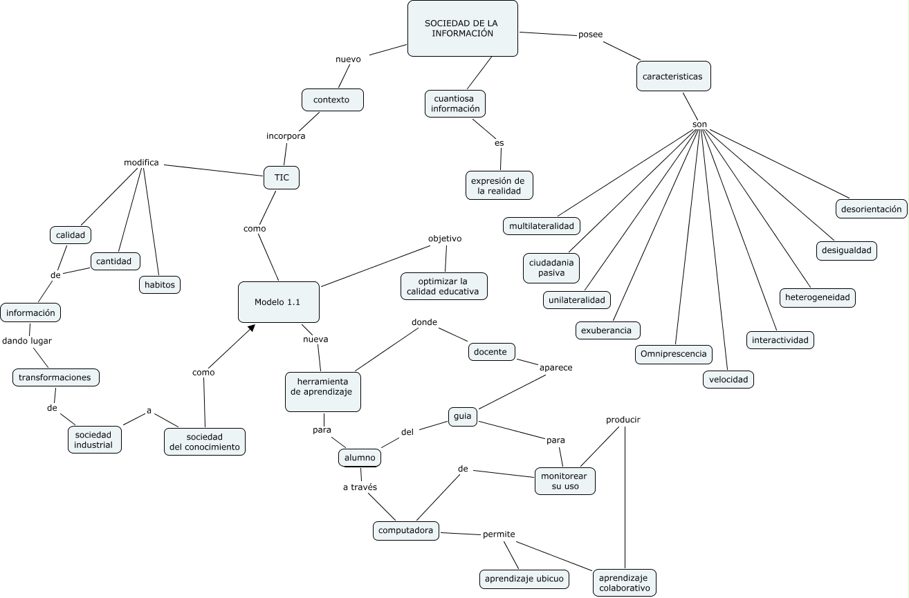 Este Cmap, tiene información relacionada con: Integración eje I -II-III, computadora permite aprendizaje ubicuo, TIC modifica habitos, guia para monitorear su uso, contexto incorpora TIC, información dando lugar transformaciones, docente aparece guia, computadora permite aprendizaje colaborativo, TIC modifica cantidad, caracteristicas son Omniprescencia, SOCIEDAD DE LA INFORMACIÓN nuevo contexto, cuantiosa información es expresión de la realidad, herramienta de aprendizaje donde docente, transformaciones de sociedad industrial, guia del ????, TIC como Modelo 1.1, Modelo 1.1 nueva herramienta de aprendizaje, alumno a través computadora, TIC modifica calidad, monitorear su uso de computadora, caracteristicas son desorientación