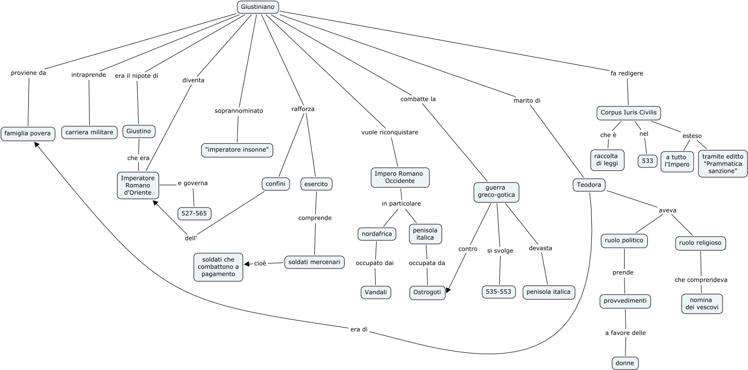 Questa Cmap, creata con IHMC CmapTools, contiene informazioni relative a: giustiniano, guerra greco-gotica devasta penisola italica, Giustiniano proviene da famiglia povera, penisola italica occupata da Ostrogoti, ruolo politico prende provvedimenti, Teodora era di famiglia povera, ruolo religioso che comprendeva nomina dei vescovi, Corpus Iuris Civilis esteso a tutto l'Impero, Corpus Iuris Civilis che è raccolta di leggi, Giustiniano combatte la guerra greco-gotica, Giustiniano fa redigere Corpus Iuris Civilis, Impero Romano Occidente in particolare nordafrica, provvedimenti a favore delle donne, Teodora aveva ruolo religioso, esercito comprende soldati mercenari, Corpus Iuris Civilis esteso tramite editto "Prammatica sanzione", Giustiniano vuole riconquistare Impero Romano Occidente, confini dell' Imperatore Romano d'Oriente, Giustiniano diventa Imperatore Romano d'Oriente, Giustiniano rafforza esercito, nordafrica occupato dai Vandali