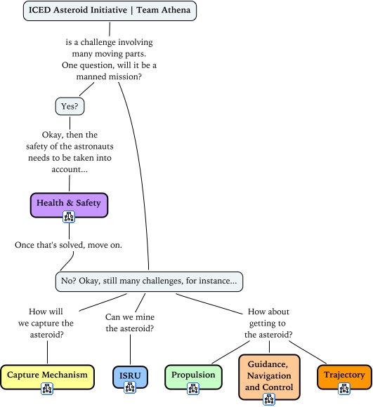 This Concept Map, created with IHMC CmapTools, has information related to: Team Athena - CMap, Yes? Okay, then the safety of the astronauts needs to be taken into account... Health & Safety, No? Okay, still many challenges, for instance... Can we mine the asteroid? ISRU, No? Okay, still many challenges, for instance... How about getting to the asteroid? Guidance, Navigation and Control, No? Okay, still many challenges, for instance... How about getting to the asteroid? Propulsion, No? Okay, still many challenges, for instance... How will we capture the asteroid? Capture Mechanism, ICED Asteroid Initiative | Team Athena is a challenge involving many moving parts. One question, will it be a manned mission? No? Okay, still many challenges, for instance..., ICED Asteroid Initiative | Team Athena is a challenge involving many moving parts. One question, will it be a manned mission? Yes?, No? Okay, still many challenges, for instance... How about getting to the asteroid? Trajectory, Health & Safety Once that's solved, move on. No? Okay, still many challenges, for instance...