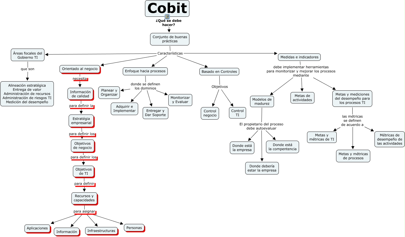 Este Cmap, tiene información relacionada con: Cobit, Recursos y capacidades para asignar Aplicaciones, Enfoque hacia procesos donde se definen los dominios Planear y Organizar, Estratégia empresarial para definir los Objetivos de negocio, Información de calidad para definir la Estratégia empresarial, Enfoque hacia procesos donde se definen los dominios Adquirir e Implementar, Conjunto de buenas prácticas Características Orientado al negocio, Metas y mediciones del desempeño para los procesos TI las métricas se definen de acuerdo a Métricas de desempeño de las actividades, Enfoque hacia procesos donde se definen los dominios Monitorizar y Evaluar, Basado en Controles Objetivos Control TI, Orientado al negocio necesita Información de calidad, Modelos de madurez El propietario del proceso debe autoevaluar Donde debería estar la empresa, Medidas e indicadores debe implementar herramientas para monitorizar y mejorar los procesos mediante Metas y mediciones del desempeño para los procesos TI, Metas y mediciones del desempeño para los procesos TI las métricas se definen de acuerdo a Metas y métricas de TI, Conjunto de buenas prácticas Características Enfoque hacia procesos, Objetivos de negocio para definir los Objetivos de TI, Medidas e indicadores debe implementar herramientas para monitorizar y mejorar los procesos mediante Metas de actividades, Conjunto de buenas prácticas Características Medidas e indicadores, Modelos de madurez El propietario del proceso debe autoevaluar Donde está la empresa, Áreas focales del Gobierno TI que son Alineación estratégica Entrega de valor Administración de recursos Administración de riesgos TI Medición del desempeño, Basado en Controles Objetivos Control negocio