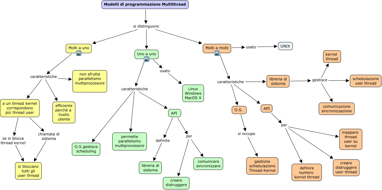Questa Cmap, creata con IHMC CmapTools, contiene informazioni relative a: ModelliProgrammazioneThread, Modelli di programmazione Multithread si distinguono Molti a molti, Molti a uno caratteristiche non sfrutta parallelismo multiprocessore, Uno a uno caratteristiche O.S gestisce scheduling, a un thread kernel corrispondono più thread user se si blocca thread kernel si bloccano tutti gli user thread, API per mappare thread user su kernel, libreria di sistema gestisce comunicazione sincronizzazione, libreria di sistema gestisce kernel thread, Uno a uno caratteristiche API, API per definire numero kernel thread, API per comunicare sincronizzare, Molti a uno caratteristiche efficiente perchè a livello utente, Modelli di programmazione Multithread si distinguono Uno a uno, Molti a molti usato UNIX, API per creare distruggere user thread, O.S. si occupa gestione schedulazione Thread-Kernel, API definite libreria di sistema, Molti a uno caratteristiche a un thread kernel corrispondono più thread user, libreria di sistema gestisce schedulazione user thread, Modelli di programmazione Multithread si distinguono Molti a uno, API per creare distruggere