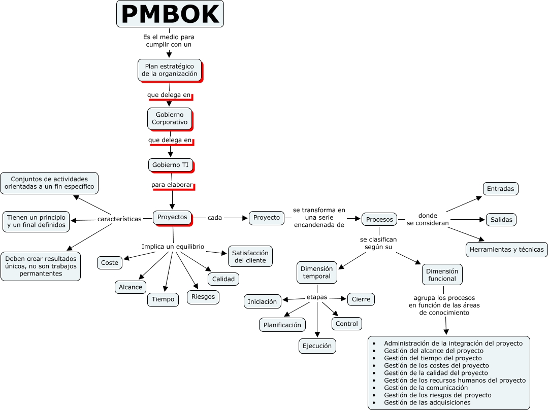 Este Cmap, tiene información relacionada con: PMBOK, Proyectos cada Proyecto, Gobierno Corporativo que delega en Gobierno TI, Proyectos Implica un equilibrio Satisfacción del cliente, Dimensión temporal etapas Ejecución, Procesos donde se consideran Entradas, Proyecto se transforma en una serie encandenada de Procesos, Dimensión temporal etapas Cierre, Proyectos Implica un equilibrio Riesgos, Proyectos características Tienen un principio y un final definidos, Proyectos Implica un equilibrio Coste, Dimensión funcional agrupa los procesos en función de las áreas de conocimiento • Administración de la integración del proyecto • Gestión del alcance del proyecto • Gestión del tiempo del proyecto • Gestión de los costes del proyecto • Gestión de la calidad del proyecto • Gestión de los recursos humanos del proyecto • Gestión de la comunicación • Gestión de los riesgos del proyecto • Gestión de las adquisiciones, Proyectos características Conjuntos de actividades orientadas a un fin específico, Procesos donde se consideran Salidas, Dimensión temporal etapas Control, Procesos se clasifican según su Dimensión funcional, Proyectos características Deben crear resultados únicos, no son trabajos permantentes, PMBOK Es el medio para cumplir con un Plan estratégico de la organización, Plan estratégico de la organización que delega en Gobierno Corporativo, Proyectos Implica un equilibrio Alcance, Proyectos Implica un equilibrio Tiempo