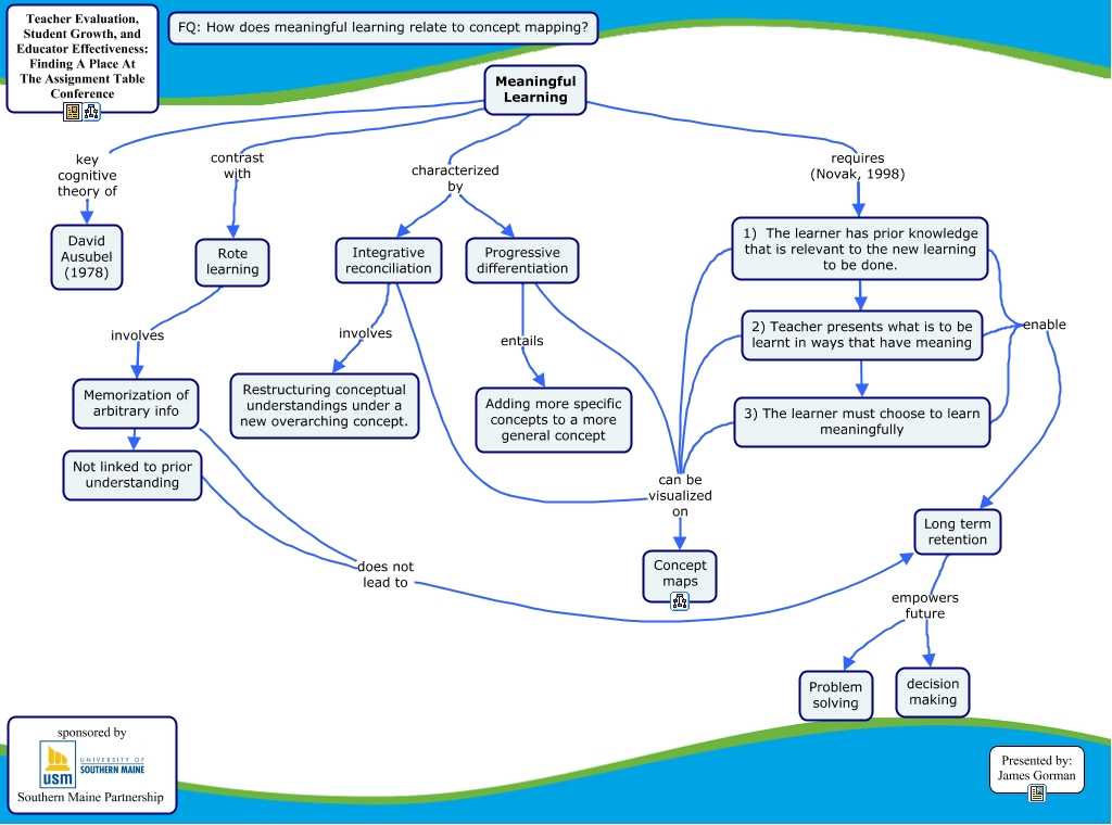 This Concept Map, created with IHMC CmapTools, has information related to: Meaningful Learning, Rote learning involves Not linked to prior understanding, 3) The learner must choose to learn meaningfully can be visualized on Concept maps, Memorization of arbitrary info does not lead to Long term retention, Progressive differentiation entails Adding more specific concepts to a more general concept, Meaningful Learning requires (Novak, 1998) 2) Teacher presents what is to be learnt in ways that have meaning, Long term retention empowers future Problem solving, Meaningful Learning key cognitive theory of David Ausubel (1978), Integrative reconciliation can be visualized on Concept maps, Meaningful Learning requires (Novak, 1998) 3) The learner must choose to learn meaningfully, Not linked to prior understanding does not lead to Long term retention, 3) The learner must choose to learn meaningfully enable Long term retention, Rote learning involves Memorization of arbitrary info, Meaningful Learning contrast with Rote learning, Integrative reconciliation involves Restructuring conceptual understandings under a new overarching concept., Meaningful Learning characterized by Progressive differentiation, 2) Teacher presents what is to be learnt in ways that have meaning enable Long term retention, Meaningful Learning characterized by Integrative reconciliation, Meaningful Learning requires (Novak, 1998) 1) The learner has prior knowledge that is relevant to the new learning to be done., 2) Teacher presents what is to be learnt in ways that have meaning can be visualized on Concept maps, Long term retention empowers future decision making