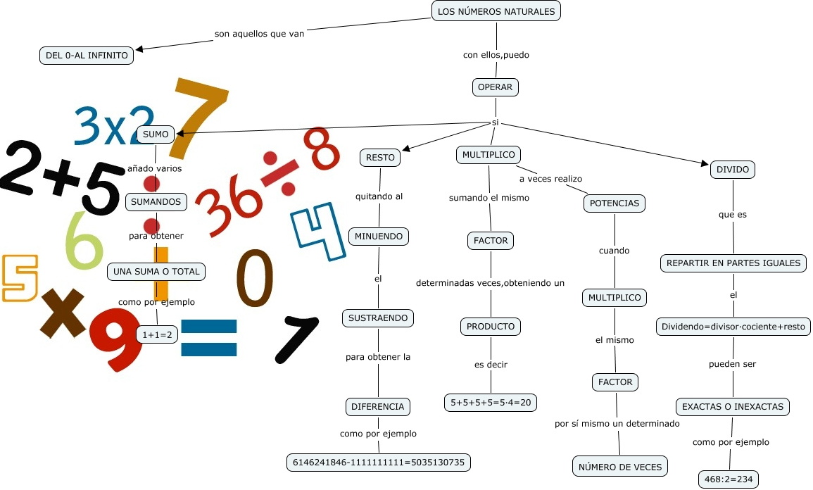 Este Cmap, tiene información relacionada con: LOS NUMEROS NATURALES,OPERACIONES-Daniel, EXACTAS O INEXACTAS como por ejemplo 468:2=234, LOS NÚMEROS NATURALES son aquellos que van DEL 0-AL INFINITO, SUMANDOS para obtener UNA SUMA O TOTAL, DIVIDO que es REPARTIR EN PARTES IGUALES, OPERAR si RESTO, OPERAR si DIVIDO, OPERAR si MULTIPLICO, FACTOR por sí mismo un determinado NÚMERO DE VECES, UNA SUMA O TOTAL como por ejemplo 1+1=2, POTENCIAS cuando MULTIPLICO, DIFERENCIA como por ejemplo 6146241846-1111111111=5035130735, MULTIPLICO sumando el mismo FACTOR, MULTIPLICO a veces realizo POTENCIAS, REPARTIR EN PARTES IGUALES el Dividendo=divisor·cociente+resto, RESTO quitando al MINUENDO, MULTIPLICO el mismo FACTOR, SUMO añado varios SUMANDOS, Dividendo=divisor·cociente+resto pueden ser EXACTAS O INEXACTAS, OPERAR si SUMO, LOS NÚMEROS NATURALES con ellos,puedo OPERAR