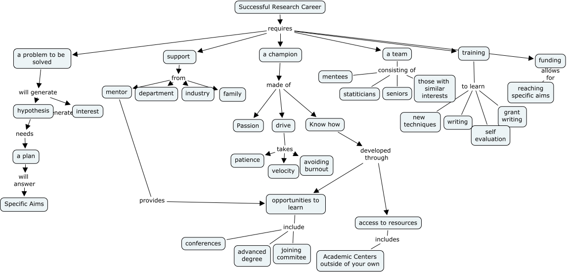 This Concept Map, created with IHMC CmapTools, has information related to: McFarlinMap2, a team consisting of those with similar interests, a champion made of Know how, Successful Research Career requires support, a champion made of Passion, a plan will answer Specific Aims, mentor provides opportunities to learn, access to resources includes Academic Centers outside of your own, support from industry, a team consisting of seniors, training to learn self evaluation, Successful Research Career requires funding, support from family, support from mentor, funding allows for reaching specific aims, Successful Research Career requires a champion, Know how developed through access to resources, a team consisting of statiticians, support from department, a team consisting of mentees, interest generates hypothesis