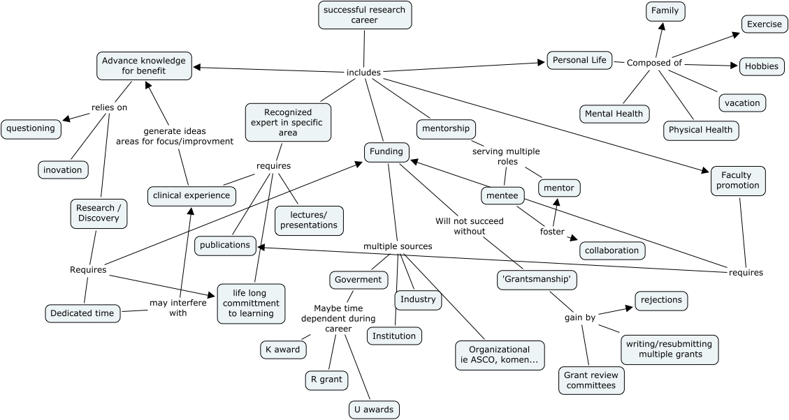 This Concept Map, created with IHMC CmapTools, has information related to: JeffreyMClarkeMap2, successful research career includes Faculty promotion, Recognized expert in specific area requires life long committment to learning, mentorship serving multiple roles mentor, Research / Discovery Requires Dedicated time, Recognized expert in specific area requires publications, Personal Life Composed of Family, Recognized expert in specific area requires lectures/ presentations, Personal Life Composed of Hobbies, Advance knowledge for benefit relies on questioning, successful research career includes Recognized expert in specific area, successful research career includes Funding, 'Grantsmanship' gain by Grant review committees, Research / Discovery Requires life long committment to learning, Faculty promotion requires publications, Recognized expert in specific area requires clinical experience, successful research career includes Personal Life, clinical experience generate ideas areas for focus/improvment Advance knowledge for benefit, Funding multiple sources Organizational ie ASCO, komen..., Funding multiple sources Goverment, Faculty promotion requires Funding