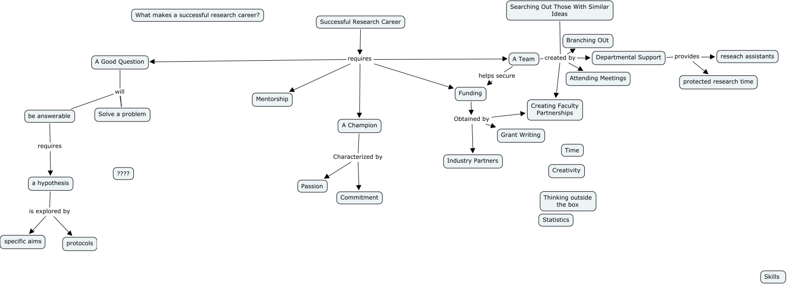 This Concept Map, created with IHMC CmapTools, has information related to: JMMcFarlinMap1, Successful Research Career requires Mentorship, a hypothesis is explored by protocols, Successful Research Career requires Funding, A Team created by Attending Meetings, A Team created by Searching Out Those With Similar Ideas, Successful Research Career requires A Good Question, A Team created by Branching OUt, A Team helps secure Funding, A Champion Characterized by Passion, be answerable requires a hypothesis, Successful Research Career requires A Team, A Team created by Departmental Support, Funding Obtained by Grant Writing, Funding Obtained by Creating Faculty Partnerships, A Good Question will Solve a problem, A Team created by Creating Faculty Partnerships, Successful Research Career requires A Champion, Funding Obtained by Industry Partners, Solve a problem will be answerable, A Champion Characterized by Commitment