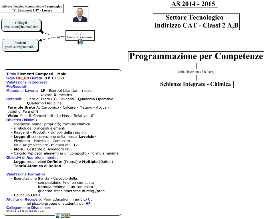 Questa Cmap, creata con IHMC CmapTools, contiene informazioni relative a: UdA_102 - Elem Composti Mole, Programmazione per Competenze della Disciplina (3 h / sett) Schienze Integrate - Chimica, prof. Marcello Preziuso e-mail Colleghi preziusom@hotmail.com, prof. Marcello Preziuso e-mail Studenti preziusom@hotmail.it