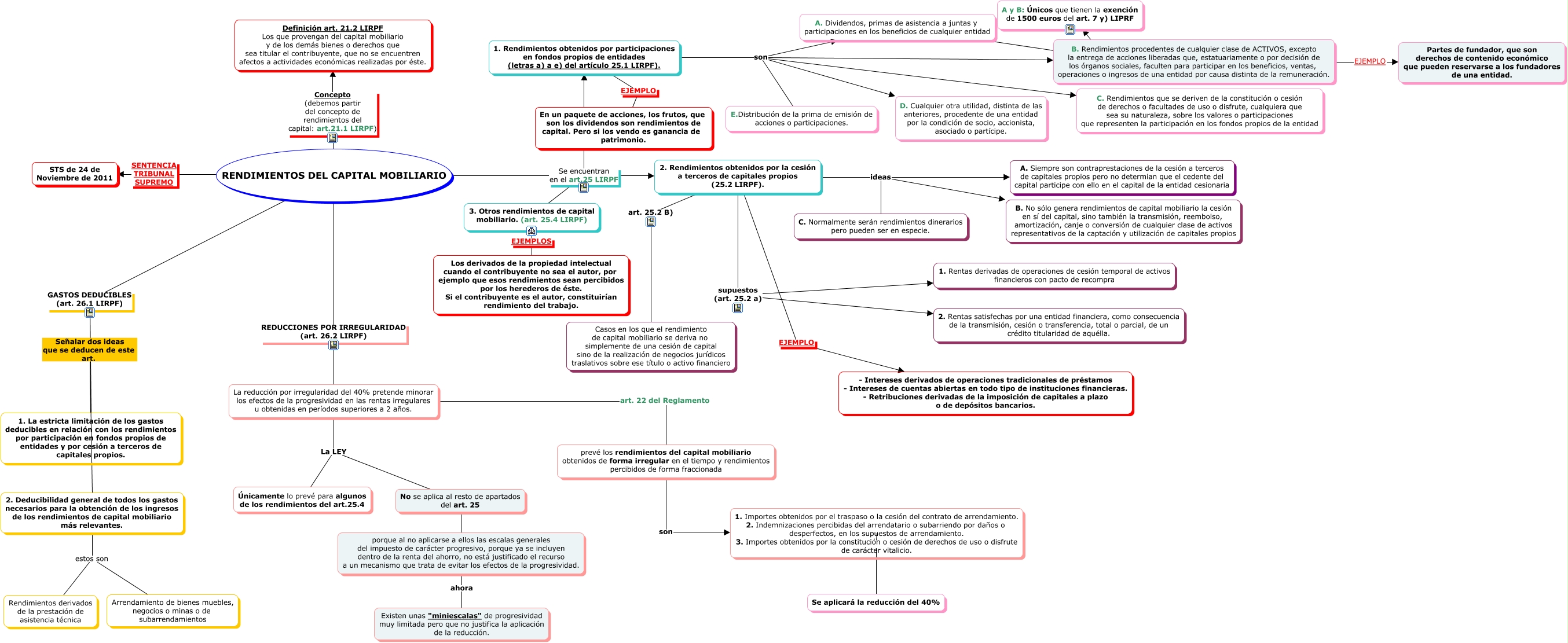 Este Cmap, tiene información relacionada con: Rendimientos del capital MOBILIARIO, 2. Rendimientos obtenidos por la cesión a terceros de capitales propios (25.2 LIRPF). supuestos (art. 25.2 a) 2. Rentas satisfechas por una entidad financiera, como consecuencia de la transmisión, cesión o transferencia, total o parcial, de un crédito titularidad de aquélla., 1. La estricta limitación de los gastos deducibles en relación con los rendimientos por participación en fondos propios de entidades y por cesión a terceros de capitales propios. Señalar dos ideas que se deducen de este art. 2. Deducibilidad general de todos los gastos necesarios para la obtención de los ingresos de los rendimientos de capital mobiliario más relevantes., La reducción por irregularidad del 40% pretende minorar los efectos de la progresividad en las rentas irregulares u obtenidas en períodos superiores a 2 años. art. 22 del Reglamento prevé los rendimientos del capital mobiliario obtenidos de forma irregular en el tiempo y rendimientos percibidos de forma fraccionada, 2. Rendimientos obtenidos por la cesión a terceros de capitales propios (25.2 LIRPF). ideas B. No sólo genera rendimientos de capital mobiliario la cesión en sí del capital, sino también la transmisión, reembolso, amortización, canje o conversión de cualquier clase de activos representativos de la captación y utilización de capitales propios, RENDIMIENTOS DEL CAPITAL MOBILIARIO GASTOS DEDUCIBLES (art. 26.1 LIRPF) 1. La estricta limitación de los gastos deducibles en relación con los rendimientos por participación en fondos propios de entidades y por cesión a terceros de capitales propios., 1. Rendimientos obtenidos por participaciones en fondos propios de entidades (letras a) a e) del artículo 25.1 LIRPF). son A. Dividendos, primas de asistencia a juntas y participaciones en los beneficios de cualquier entidad, 3. Otros rendimientos de capital mobiliario. (art. 25.4 LIRPF) EJEMPLOS Los derivados de la propiedad intelectual cuando el contribuyente no sea el autor, por ejemplo que esos rendimientos sean percibidos por los herederos de éste. Si el contribuyente es el autor, constituirían rendimiento del trabajo., 2. Rendimientos obtenidos por la cesión a terceros de capitales propios (25.2 LIRPF). EJEMPLO - Intereses derivados de operaciones tradicionales de préstamos - Intereses de cuentas abiertas en todo tipo de instituciones financieras. - Retribuciones derivadas de la imposición de capitales a plazo o de depósitos bancarios., 1. Importes obtenidos por el traspaso o la cesión del contrato de arrendamiento. 2. Indemnizaciones percibidas del arrendatario o subarriendo por daños o desperfectos, en los supuestos de arrendamiento. 3. Importes obtenidos por la constitución o cesión de derechos de uso o disfrute de carácter vitalicio. ???? Se aplicará la reducción del 40%, RENDIMIENTOS DEL CAPITAL MOBILIARIO Se encuentran en el art.25 LIRPF 3. Otros rendimientos de capital mobiliario. (art. 25.4 LIRPF), 1. Rendimientos obtenidos por participaciones en fondos propios de entidades (letras a) a e) del artículo 25.1 LIRPF). son D. Cualquier otra utilidad, distinta de las anteriores, procedente de una entidad por la condición de socio, accionista, asociado o partícipe., La reducción por irregularidad del 40% pretende minorar los efectos de la progresividad en las rentas irregulares u obtenidas en períodos superiores a 2 años. La LEY Únicamente lo prevé para algunos de los rendimientos del art.25.4, A. Dividendos, primas de asistencia a juntas y participaciones en los beneficios de cualquier entidad ???? A y B: Únicos que tienen la exención de 1500 euros del art. 7 y) LIPRF, RENDIMIENTOS DEL CAPITAL MOBILIARIO Se encuentran en el art.25 LIRPF 1. Rendimientos obtenidos por participaciones en fondos propios de entidades (letras a) a e) del artículo 25.1 LIRPF)., porque al no aplicarse a ellos las escalas generales del impuesto de carácter progresivo, porque ya se incluyen dentro de la renta del ahorro, no está justificado el recurso a un mecanismo que trata de evitar los efectos de la progresividad. ahora Existen unas "miniescalas" de progresividad muy limitada pero que no justifica la aplicación de la reducción., RENDIMIENTOS DEL CAPITAL MOBILIARIO Se encuentran en el art.25 LIRPF 2. Rendimientos obtenidos por la cesión a terceros de capitales propios (25.2 LIRPF)., 2. Rendimientos obtenidos por la cesión a terceros de capitales propios (25.2 LIRPF). supuestos (art. 25.2 a) 1. Rentas derivadas de operaciones de cesión temporal de activos financieros con pacto de recompra, La reducción por irregularidad del 40% pretende minorar los efectos de la progresividad en las rentas irregulares u obtenidas en períodos superiores a 2 años. La LEY No se aplica al resto de apartados del art. 25, 2. Rendimientos obtenidos por la cesión a terceros de capitales propios (25.2 LIRPF). art. 25.2 B) Casos en los que el rendimiento de capital mobiliario se deriva no simplemente de una cesión de capital sino de la realización de negocios jurídicos traslativos sobre ese título o activo financiero, No se aplica al resto de apartados del art. 25 ???? porque al no aplicarse a ellos las escalas generales del impuesto de carácter progresivo, porque ya se incluyen dentro de la renta del ahorro, no está justificado el recurso a un mecanismo que trata de evitar los efectos de la progresividad.