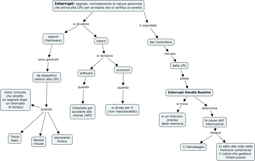 Questa Cmap, creata con IHMC CmapTools, contiene informazioni relative a: Interrupt, Interrupt: segnale, normalemente di natura asincrona che arriva alla CPU per avvisarla che si verifica un evento è segnalato dal Controllore, le cause dell' interruzione esegue 2) salto alla cella della memoria contenente il codice che gestisce l'interruzione, interni si dividono software, da dispositivi esterni alla CPU quando Tocca tasto, software quando Chiamate per accedere alle risorse (API), eccezioni quando si divide per 0 (non mascherabile), le cause dell' interruzione esegue 1) Salvataggio, da dispositivi esterni alla CPU quando stampante finisce, Interrupt: segnale, normalemente di natura asincrona che arriva alla CPU per avvisarla che si verifica un evento si dividono esterni (hardware), da dispositivi esterni alla CPU quando timer (circuito che emette un segnale dopo un intervallo di tempo), da dispositivi esterni alla CPU quando Sposta mouse, interni si dividono eccezioni, Interrupt Handle Routine si trova in un indirizzo preciso della memoria, Interrupt Handle Routine determina le cause dell' interruzione, dal Controllore rilevato dalla cPU, dalla cPU passa Interrupt Handle Routine, esterni (hardware) sono generati da dispositivi esterni alla CPU, Interrupt: segnale, normalemente di natura asincrona che arriva alla CPU per avvisarla che si verifica un evento si dividono interni