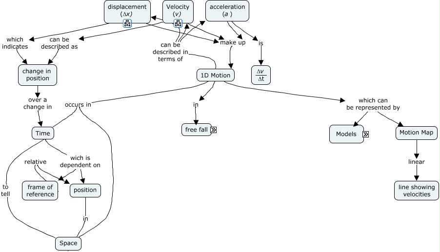 Αυτός ο εννοιολογικός χάρτης, που δημιουργήθηκε με το IHMC Cmap Tools, περιέχει πλήροφορίες που σχετίζονται με: xarths, 1D Motion can be described in terms of displacement (Δx), acceleration (a) is <math xmlns="http://www.w3.org/1998/Math/MathML"> <mrow> <mfrac> <mtext> Δv </mtext> <mtext> Δt </mtext> </mfrac> </mrow> </math>, 1D Motion in free fall, 1D Motion occurs in Time, Velocity (v) can be described as change in position, position in Space, free fall is dependant on objects mass, displacement (Δx) make up 1D Motion, speed Which has Two magnitudes, Velocity (v) make up 1D Motion, 1D Motion which can be represented by Motion Map, free fall is dependant on acceleration, displacement (Δx) which indicates change in position, 1D Motion occurs in Space, scalar vector has total displacement, acceleration (a) make up 1D Motion, 1D Motion which can be represented by Models, Models wich can be scalar vector, Models wich can be vector, 1D Motion can be described in terms of acceleration (a)