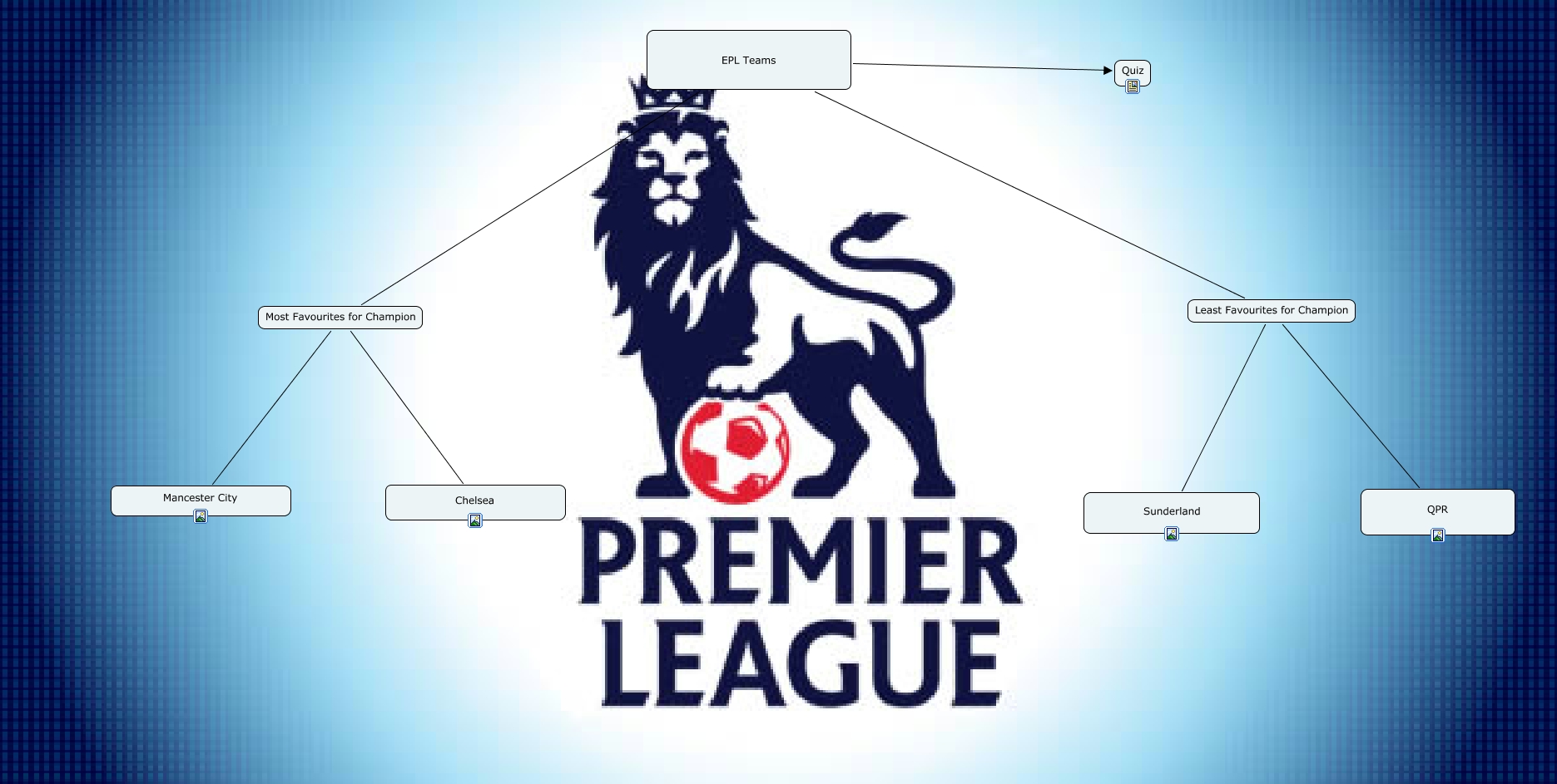 This Concept Map, created with IHMC CmapTools, has information related to: Final, EPL Teams Most Favourites for Champion, Least Favourites for Champion Sunderland, EPL Teams Quiz, Most Favourites for Champion Mancester City, EPL Teams Least Favourites for Champion, Least Favourites for Champion QPR, Most Favourites for Champion Chelsea