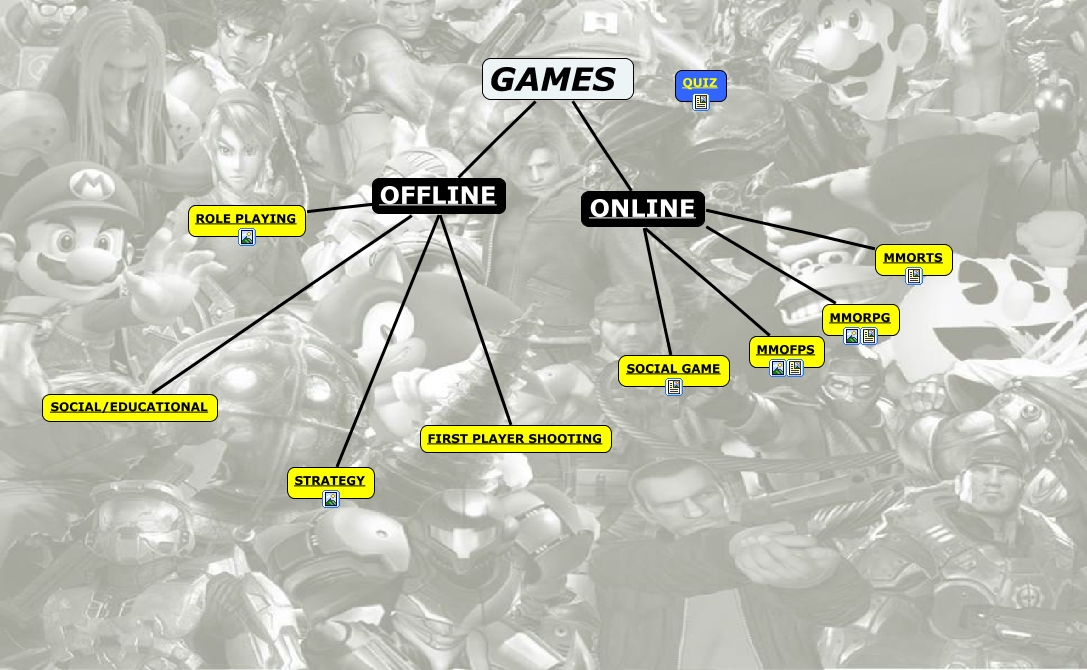 This Concept Map, created with IHMC CmapTools, has information related to: GAMES, FIRST PLAYER SHOOTING OFFLINE, MMORTS ONLINE, OFFLINE GAMES, MMOFPS ONLINE, MMORPG ONLINE, ROLE PLAYING OFFLINE, SOCIAL/EDUCATIONAL OFFLINE, STRATEGY OFFLINE, ONLINE GAMES, SOCIAL GAME ONLINE