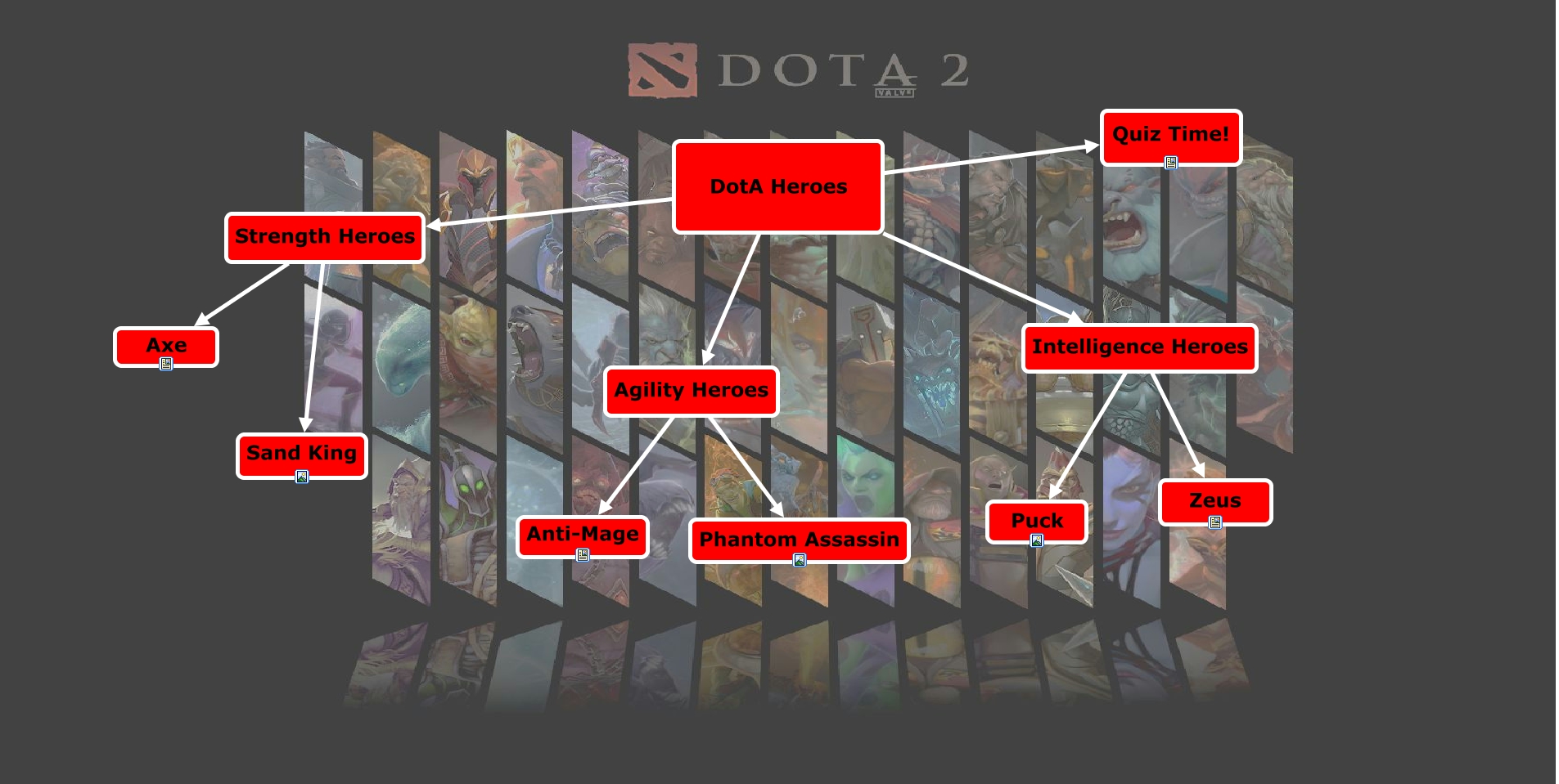This Concept Map, created with IHMC CmapTools, has information related to: Dota Heroes, DotA Heroes Strength Heroes, Agility Heroes Anti-Mage, DotA Heroes Intelligence Heroes, DotA Heroes Agility Heroes, DotA Heroes Quiz Time!, Strength Heroes Sand King, Intelligence Heroes Zeus, Agility Heroes Phantom Assassin, Intelligence Heroes Puck, Strength Heroes Axe