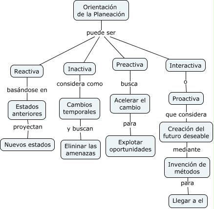 Este Cmap, tiene información relacionada con: PlaneacionOrientacion, Invención de métodos para Llegar a el, Preactiva busca Acelerar el cambio, Interactiva o Proactiva, Orientación de la Planeación puede ser Inactiva, Orientación de la Planeación puede ser Reactiva, Inactiva considera como Cambios temporales, Creación del futuro deseable mediante Invención de métodos, Estados anteriores proyectan Nuevos estados, Reactiva basándose en Estados anteriores, Proactiva que considera Creación del futuro deseable, Acelerar el cambio para Explotar oportunidades, Orientación de la Planeación puede ser Interactiva, Orientación de la Planeación puede ser Preactiva, Cambios temporales y buscan Elininar las amenazas