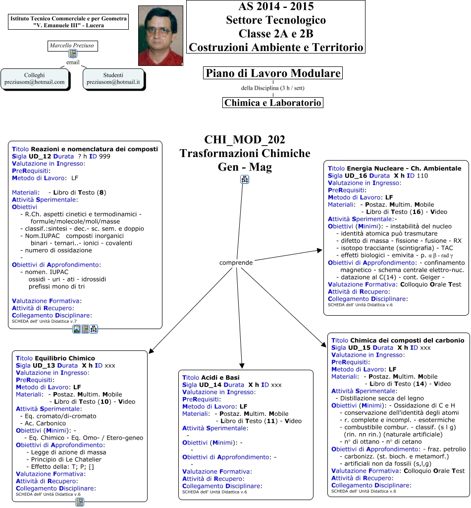 Questa Cmap, creata con IHMC CmapTools, contiene informazioni relative a: T_CHI_MOD_202 Trasformazioni Chimiche, CHI_MOD_202 Trasformazioni Chimiche Gen - Mag comprende Titolo Equilibrio Chimico Sigla UD_13 Durata X h ID xxx Valutazione in Ingresso: PreRequisiti: Metodo di Lavoro: LF Materiali: - Postaz. Multim. Mobile - Libro di Testo (10) - Video Attività Sperimentale: - Eq. cromato/di-cromato - Ac. Carbonico Obiettivi (Minimi): - - Eq. Chimico - Eq. Omo- / Etero-geneo Obiettivi di Approfondimento: - Legge di azione di massa - Principio di Le Chatelier - Effetto della: T; P; [] Valutazione Formativa: Attività di Recupero: Collegamento Disciplinare: SCHEDA dell' Unità Didattica v.6, Marcello Preziuso email Colleghi preziusom@hotmail.com, CHI_MOD_202 Trasformazioni Chimiche Gen - Mag comprende Titolo Energia Nucleare - Ch. Ambientale Sigla UD_16 Durata X h ID 110 Valutazione in Ingresso: PreRequisiti: Metodo di Lavoro: LF Materiali: - Postaz. Multim. Mobile - Libro di Testo (16) - Video Attività Sperimentale:- Obiettivi (Minimi): - instabilità del nucleo - identità atomica può trasmutare - difetto di massa - fissione - fusione - RX - isotopo tracciante (scintigrafia) - TAC - effetti biologici - emivita - p. α β - rad γ Obiettivi di Approfondimento: - confinamento magnetico - schema centrale elettro-nuc. - datazione al C(14) - cont. Geiger - Valutazione Formativa: Colloquio Orale Test Attività di Recupero: Collegamento Disciplinare: SCHEDA dell' Unità Didattica v.6, CHI_MOD_202 Trasformazioni Chimiche Gen - Mag comprende Titolo Acidi e Basi Sigla UD_14 Durata X h ID xxx Valutazione in Ingresso: PreRequisiti: Metodo di Lavoro: LF Materiali: - Postaz. Multim. Mobile - Libro di Testo (11) - Video Attività Sperimentale: - Obiettivi (Minimi): - - Obiettivi di Approfondimento: - - Valutazione Formativa: Attività di Recupero: Collegamento Disciplinare: SCHEDA dell' Unità Didattica v.6, CHI_MOD_202 Trasformazioni Chimiche Gen - Mag comprende Titolo Chimica dei composti del carbonio Sigla UD_15 Durata X h ID xxx Valutazione in Ingresso: PreRequisiti: Metodo di Lavoro: LF Materiali: - Postaz. Multim. Mobile - Libro di Testo (14) - Video Attività Sperimentale: - Distillazione secca del legno Obiettivi (Minimi): - Ossidazione di C e H - conservazione dell'identità degli atomi - r. complete e incompl. - esotermiche - combustibile combur. - classif. (s l g) (rin. nn rin.) (naturale artificiale) - n° di ottano - n° di cetano Obiettivi di Approfondimento: - fraz. petrolio - carbonizz. (st. bioch. e metamorf.) - artificiali non da fossili (s,l,g) Valutazione Formativa: Colloquio Orale Test Attività di Recupero: Collegamento Disciplinare: SCHEDA dell' Unità Didattica v.6, Marcello Preziuso email Studenti preziusom@hotmail.it, Piano di Lavoro Modulare della Disciplina (3 h / sett) Chimica e Laboratorio