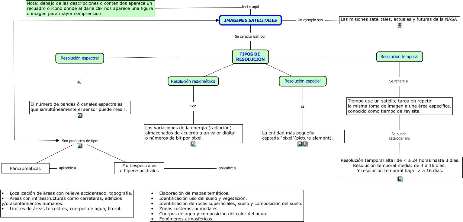 Este Cmap, tiene información relacionada con: Tipos de Resolucion Imagenes Satelitales, Resolución espectral Es El número de bandas ó canales espectrales que simultáneamente el sensor puede medir., IMAGENES SATELITALES Se caracterizan por TIPOS DE RESOLUCION, El número de bandas ó canales espectrales que simultáneamente el sensor puede medir. Son productos de tipo: Pancromáticas, TIPOS DE RESOLUCION Resolución temporal, Pancromáticas aplicable a • Localización de áreas con relieve accidentado, topografia. • Áreas con infraestructuras como carreteras, edificios y/o asentamientos humanos. • Limites de áreas terrestres, cuerpos de agua, litoral., El número de bandas ó canales espectrales que simultáneamente el sensor puede medir. Son productos de tipo: IMAGENES SATELITALES, Resolución temporal Se refiere al Tiempo que un satélite tarda en repetir la misma toma de imagen a una área específica. conocido como tiempo de revisita., El número de bandas ó canales espectrales que simultáneamente el sensor puede medir. Son productos de tipo: Multiespectrales e hiperespectrales, IMAGENES SATELITALES Un ejemplo son Las misiones satelitales, actuales y futuras de la NASA, Las variaciones de la energía (radiación) almacenados de acuerdo a un valor digital o números de bit por pixel. Son Resolución radiométrica, Resolución espacial TIPOS DE RESOLUCION, Resolución radiométrica TIPOS DE RESOLUCION, Multiespectrales e hiperespectrales aplicable a • Elaboración de mapas temáticos. • Identificación uso del suelo y vegetación. • Identificación de rocas superficiales, suelo y composición del suelo. • Zonas costeras, humedales. • Cuerpos de agua y composición del color del agua. • Fenómenos atmosféricos., TIPOS DE RESOLUCION Resolución espectral, IMAGENES SATELITALES Inciar aqui Nota: debajo de las descripciones o contenidos aparece un recuadro o ícono donde al darle clik nos aparece una figura o imagen para mayor comprension, Resolución espacial Es La entidad más pequeña captada "pixel"(picture element)., Tiempo que un satélite tarda en repetir la misma toma de imagen a una área específica. conocido como tiempo de revisita. Se puede catalogar en: Resolución temporal alta: de < a 24 horas hasta 3 días. Resolución temporal media: de 4 a 16 días. Y resolución temporal baja: > a 16 días.
