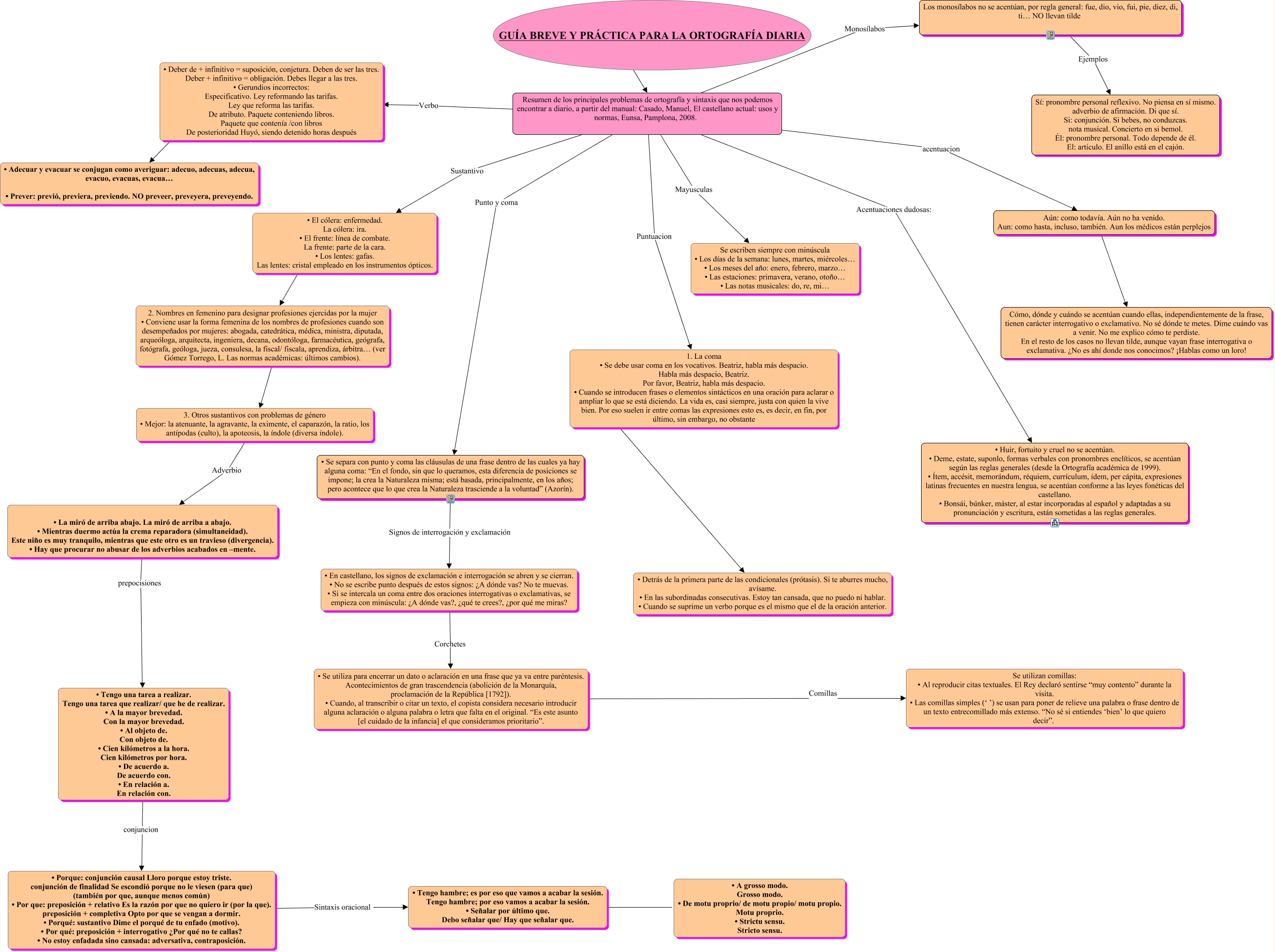 Este Cmap, tiene información relacionada con: TFC-Base de conocimiento, Resumen de los principales problemas de ortografía y sintaxis que nos podemos encontrar a diario, a partir del manual: Casado, Manuel, El castellano actual: usos y normas, Eunsa, Pamplona, 2008. Punto y coma • Se separa con punto y coma las cláusulas de una frase dentro de las cuales ya hay alguna coma: “En el fondo, sin que lo queramos, esta diferencia de posiciones se impone; la crea la Naturaleza misma; está basada, principalmente, en los años; pero acontece que lo que crea la Naturaleza trasciende a la voluntad” (Azorín)., 2. Nombres en femenino para designar profesiones ejercidas por la mujer • Conviene usar la forma femenina de los nombres de profesiones cuando son desempeñados por mujeres: abogada, catedrática, médica, ministra, diputada, arqueóloga, arquitecta, ingeniera, decana, odontóloga, farmacéutica, geógrafa, fotógrafa, geóloga, jueza, consulesa, la fiscal/ fiscala, aprendiza, árbitra… (ver Gómez Torrego, L. Las normas académicas: últimos cambios). ???? 3. Otros sustantivos con problemas de género • Mejor: la atenuante, la agravante, la eximente, el caparazón, la ratio, los antípodas (culto), la apoteosis, la índole (diversa índole)., Resumen de los principales problemas de ortografía y sintaxis que nos podemos encontrar a diario, a partir del manual: Casado, Manuel, El castellano actual: usos y normas, Eunsa, Pamplona, 2008. Acentuaciones dudosas: • Huir, fortuito y cruel no se acentúan. • Deme, estate, suponlo, formas verbales con pronombres enclíticos, se acentúan según las reglas generales (desde la Ortografía académica de 1999). • Ítem, accésit, memorándum, réquiem, currículum, ídem, per cápita, expresiones latinas frecuentes en nuestra lengua, se acentúan conforme a las leyes fonéticas del castellano. • Bonsái, búnker, máster, al estar incorporadas al español y adaptadas a su pronunciación y escritura, están sometidas a las reglas generales., Resumen de los principales problemas de ortografía y sintaxis que nos podemos encontrar a diario, a partir del manual: Casado, Manuel, El castellano actual: usos y normas, Eunsa, Pamplona, 2008. Sustantivo • El cólera: enfermedad. La cólera: ira. • El frente: línea de combate. La frente: parte de la cara. • Los lentes: gafas. Las lentes: cristal empleado en los instrumentos ópticos., Resumen de los principales problemas de ortografía y sintaxis que nos podemos encontrar a diario, a partir del manual: Casado, Manuel, El castellano actual: usos y normas, Eunsa, Pamplona, 2008. Mayusculas Se escriben siempre con minúscula • Los días de la semana: lunes, martes, miércoles… • Los meses del año: enero, febrero, marzo… • Las estaciones: primavera, verano, otoño… • Las notas musicales: do, re, mi…, • Se utiliza para encerrar un dato o aclaración en una frase que ya va entre paréntesis. Acontecimientos de gran trascendencia (abolición de la Monarquía, proclamación de la República [1792]). • Cuando, al transcribir o citar un texto, el copista considera necesario introducir alguna aclaración o alguna palabra o letra que falta en el original. “Es este asunto [el cuidado de la infancia] el que consideramos prioritario”. Comillas Se utilizan comillas: • Al reproducir citas textuales. El Rey declaró sentirse “muy contento” durante la visita. • Las comillas simples (‘ ’) se usan para poner de relieve una palabra o frase dentro de un texto entrecomillado más extenso. “No sé si entiendes ‘bien’ lo que quiero decir”., • Tengo hambre; es por eso que vamos a acabar la sesión. Tengo hambre; por eso vamos a acabar la sesión. • Señalar por último que. Debo señalar que/ Hay que señalar que. • A grosso modo. Grosso modo. • De motu proprio/ de motu propio/ motu propio. Motu proprio. • Strictu sensu. Stricto sensu., Resumen de los principales problemas de ortografía y sintaxis que nos podemos encontrar a diario, a partir del manual: Casado, Manuel, El castellano actual: usos y normas, Eunsa, Pamplona, 2008. Monosílabos Los monosílabos no se acentúan, por regla general: fue, dio, vio, fui, pie, diez, di, ti… NO llevan tilde, 1. La coma • Se debe usar coma en los vocativos. Beatriz, habla más despacio. Habla más despacio, Beatriz. Por favor, Beatriz, habla más despacio. • Cuando se introducen frases o elementos sintácticos en una oración para aclarar o ampliar lo que se está diciendo. La vida es, casi siempre, justa con quien la vive bien. Por eso suelen ir entre comas las expresiones esto es, es decir, en fin, por último, sin embargo, no obstante ???? • Detrás de la primera parte de las condicionales (prótasis). Si te aburres mucho, avísame. • En las subordinadas consecutivas. Estoy tan cansada, que no puedo ni hablar. • Cuando se suprime un verbo porque es el mismo que el de la oración anterior., GUÍA BREVE Y PRÁCTICA PARA LA ORTOGRAFÍA DIARIA ???? Resumen de los principales problemas de ortografía y sintaxis que nos podemos encontrar a diario, a partir del manual: Casado, Manuel, El castellano actual: usos y normas, Eunsa, Pamplona, 2008., • En castellano, los signos de exclamación e interrogación se abren y se cierran. • No se escribe punto después de estos signos: ¿A dónde vas? No te muevas. • Si se intercala un coma entre dos oraciones interrogativas o exclamativas, se empieza con minúscula: ¿A dónde vas?, ¿qué te crees?, ¿por qué me miras? Corchetes • Se utiliza para encerrar un dato o aclaración en una frase que ya va entre paréntesis. Acontecimientos de gran trascendencia (abolición de la Monarquía, proclamación de la República [1792]). • Cuando, al transcribir o citar un texto, el copista considera necesario introducir alguna aclaración o alguna palabra o letra que falta en el original. “Es este asunto [el cuidado de la infancia] el que consideramos prioritario”., R